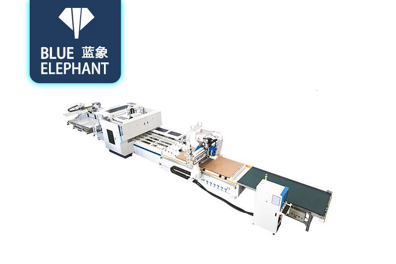 藍象自動貼標鉆銑一體機將鉆孔、拉槽、切割下料等多個加工工序集于一體,相比傳統加工方式,它能夠實現板件的一次性加工,大大提高了加工效率。